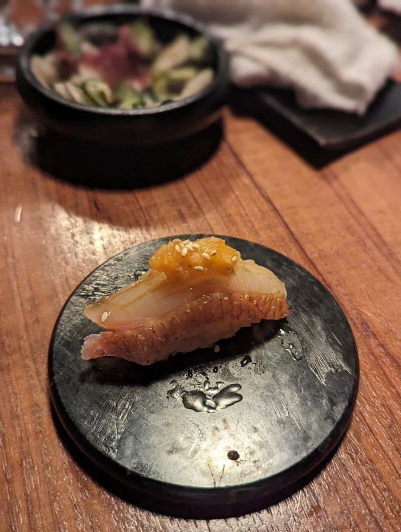 When we arrived the host confirmed our dietary restrictions, handed us a signature cocktail, and led us to a small anteroom where we could size up the other guests. But seriously, one of my favorite parts of omakase is how everyone sits together at a single, cozy bar and you almost can’t avoid meeting your fellow diners. With luck, by the end of the night you’re laughing and making new friends.