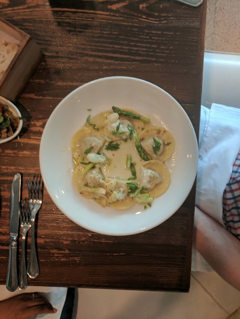 And for me, MEZZALUNA texas lamb, asparagus, spring onion caponata, parmesan brodo, pecorino. The real stand-out here were the spring onions which were cooked lightly in butter right to the point where they transition from oniony to sweet, but still keeping their crispness. Perfect counterpoint to the rich pockets of shaved lamb drizzled in butter oil.